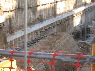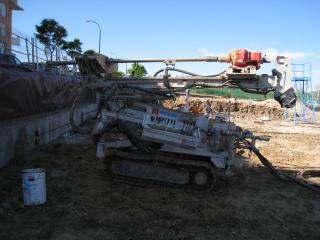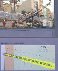 ud. Ejecución de anclaje temporal (máximo 2 años s/ CTE) de pantalla de pilotes o muro pantalla hasta 30 T., incluyendo: a) perforación con inclinación de 30° (o la que determine el cálculo), introducción de 2 cables de acero compuesto cada uno de 7 cables de 4 mm en espiral ( o los que determine el cálculo) envainados en el tramo libre, e inyección a través de tubo con lechada de cemento de alta resistencia tipo SULFADUR I-52,5/SR, y a la profundidad que se establezca en el estudio de estabilidad; b) Longitud libre de perforación de al menos 5 m y longitud de bulbo (longitud de sellado y anclaje por inyección al terreno) de al menos 6 m. Dichas longitudes vendrán determinadas de forma definitiva por cálculo una vez realizado un estudio de estabilidad de la zona de transmisión de los esfuerzos y comprobación que la misma queda fuera de la masa pésima de deslizamiento (en función de la longitud de los pilotes y tipo de terreno); c) suministro y colocación de cabeza/viga de reparto de anclaje de 30 T. y su puesta en carga (tesado) mediante gato monofilar y la viga metálica de longitud hasta 1,2 m (para recoger, por ejemplo, 2 pilotes de 40 cm separados 80 cm) formada por 2 UPN-180 en cajón y chapa metálica de 10 mm de espesor mínimo s/ CTE formando pieza especial en concepto de transmisor del esfuerzo; d) La separación entre perforaciones será de 2,40 m (dejando un pilote sin anclar entre dos grupos anclados) o la que determine el cálculo. Incluso transporte de maquinaria, montaje y desmontaje de los equipos.