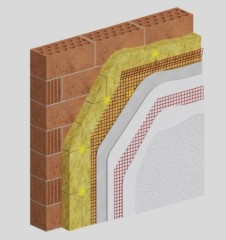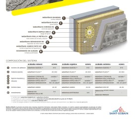 m². Sistema universal de aislamiento térmico por el exterior para fachadas, webertherm ROBUSTO acabado orgánico, consistente en: suministro de las placas aislantes rígidas de lana de roca monodensidad, webertherm PLACA TF PROFI, con código de designación según la norma MW-EN 13162: T5 - DS(TH) - CS(10)30 - TR10 - WS - WL(P) - MU1, Euroclase A1 de reacción al fuego y conductividad térmica 0,035 W/m·K, de 80 mm de espesor. Las placas deben ser colocadas en posición horizontal en filas sucesivas, de abajo a arriba, a rompe-juntas en relación con la hilera anterior, y serán adheridas mediante el mortero monocomponente para la adhesión y regularización de paneles de aislamiento térmico, webertherm BASEGEL, compuesto a base de cemento gris, cargas minerales, resinas redispersables en polvo, fibra de vidrio de alta dispersión y aditivos especiales; y con las siguientes características técnicas: adherencia sobre ladrillo cerámico = 0,3 MPa, adherencia sobre webertherm AISLONE y sobre webertherm PLACA EPS = 0,08 MPa (CFS), absorción agua por capilaridad = 0,2 kg/m² ·min0,5 (Clase W2), µ = 10, resistencia a flexión = 2 MPa, resistencia a compresión = 6,0 MPa (CSIV), reacción al fuego Euroclase A1 y conductividad térmica 0,44 W/m·K. La aplicación del mortero como adhesivo se realizará directamente en el reverso de la placa mediante cordón perimetral y pegotes centrales asegurando una superficie de adhesión mínima del 40%, o bien mediante doble encolado con llana dentada de 10 x 10 mm, en caso de aplicación posterior sobre el soporte plano (irregularidades inferiores a 10 mm bajo un regle de 2 m), con un espesor total de 1 cm. Una vez seco el mortero de adhesión (transcurridas 24 horas), colocación las coronas de separación webertherm CORONA RS en los puntos de fijación formando una cuadrícula con una distancia entre ejes de 40 cm, realizando un taladro de 8 mm a través de su orificio central. En los paneles donde no coincida la posición de la corona con el centro de la misma, colocación de una espiga de fijación independientemente de la cuadrícula y sin corona. Colocación posterior de la malla metálica webertherm MALLA METÁLICA sobre las coronas de separación instaladas y fijación de ésta con espigas de núcleo metálico atornilladas webertherm ESPIGA SRD 5 coincidentes con las coronas. Colocación de espaciadores webertherm SEPARADOR RD. Posteriormente realización del revestimiento de las placas aislantes con el mortero de revoco base, webercal AISROC con las siguientes características técnicas: resistencia a la compresión = 0,4 N/mm² (hasta 2,5 N/mm²); resistencia a la flexotracción = 0,25 N/mm²; coeficiente de difusión al vapor de agua µ = 5; adherencia sobre ladrillo = 0,30 N/mm²; conductividad térmica € = 0,1 W/m·K (Clase T1) y densidad producto endurecido 400-500 kg/m³; previa realización de maestras, aplicado mediante proyección mecánica en una sola mano; el espesor final después del relleno debe ser de 2 cm. Con el producto regularizado y aun en fresco, colocación de las mallas de refuerzo de fibra de vidrio adicionales en los vértices de los huecos existentes para evitar fisuras (no incl.). Pasadas de 1 a 4 horas, en fase plástica casi completa, realización del fratasado y compactado del mortero para dejar una superficie apta para recibir el acabado. Suministro y aplicación de mortero monocomponente de altas prestaciones para regularización de superficies, webertherm BASEGEL, aplicado en un espesor de 2-3 mm por mano, en dos manos y armado con malla de fibra de vidrio alcalino-resistente webertherm MALLA 160, con apertura del entramado 3,5 x 3,8 mm, 160 g/m², espesor 0,52 mm, valor nominal de resistencia a tracción en condiciones estándar de 2200 / 2200 y resistencia a elongación 3,8 / 3,8, embebida en la mitad del espesor; se aplicará una primera mano de mortero regularizador sobre la que se colocará, en fresco, la malla de refuerzo. Pasadas 24h y ya seca la primera mano, se aplicará una segunda mano de mortero regularizador cubriendo la malla en su totalidad y dejando una superficie lisa y apta para recibir el acabado. Finalmente, se aplicará el revestimiento de acabado webertene CLASSIC (disponible en granulometrías: XL= máx. 2,5 mm y L= máx. 1,5 mm), compuesto a base de resinas acrílicas, cargas minerales, pigmentos estables a UV, fungicidas y aditivos especiales y con las siguientes características técnicas: conductividad térmica 1,3 W/m·K, absorción agua por capilaridad W2, permeabilidad al vapor µ=120 (V1 SD=0,25) y reacción al fuego Euroclase A2, aplicado a gota con pistola o fratasado con llana según indicaciones de la ficha técnica (granulometría, textura y color a definir por la D.F.), con aplicación previa de la imprimación de fondeo universal webertene PRIMER, compuesto de mezcla de copolímeros acrílicos, cargas minerales, modificadores reológicos y aditivos especiales. Medido a cinta corrida descontando el 50% de los huecos mayores de 4 m². Incluso p/p de suministro y colocación de perfiles de arranque y de esquina, formación de juntas, rincones, aristas, mochetas, jambas, dinteles, remates en los encuentros con paramentos, revestimientos u otros elementos recibidos en su superficie.