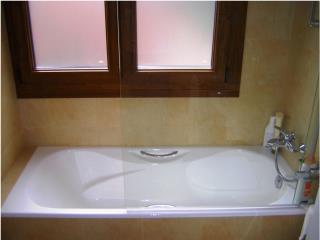 ud. Bañera de fundición con fondo antideslizante de Roca o similar, modelo Malibú en blanco de 1,50x0,75 m, con grifería baño-ducha-teléfono de Roca o similar, modelo Monomando Naia cromada o similar y válvula con rebosadero de 32-40 mm, totalmente instalado.